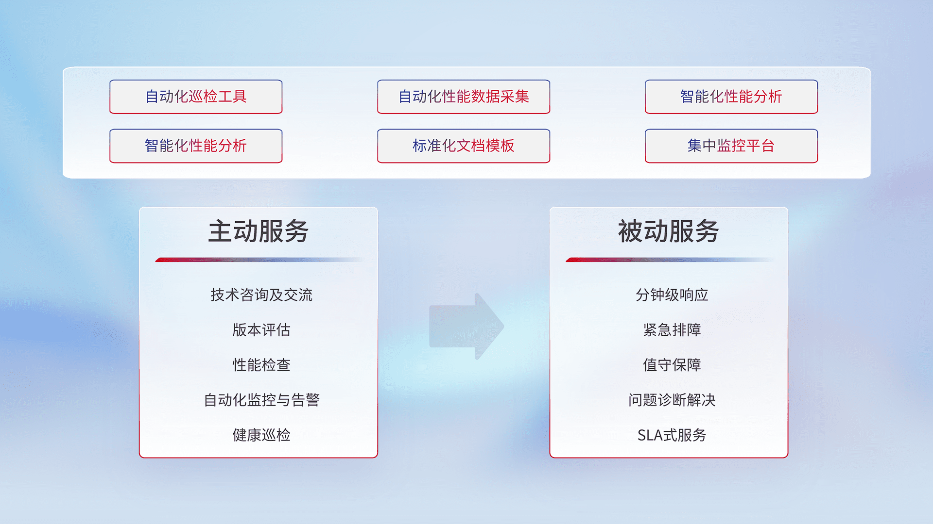 智能化工具和标准化文档,,,保障服务质量,,提供主动服务(包含技术咨询、、版本评估、、、性能检查、、自动化监控与告警、、、健康巡检)和被动服务包含(分钟级响应、、、、紧急排障、、、、值守保障、、、问题诊断解决、、、SLA服务)。。。。